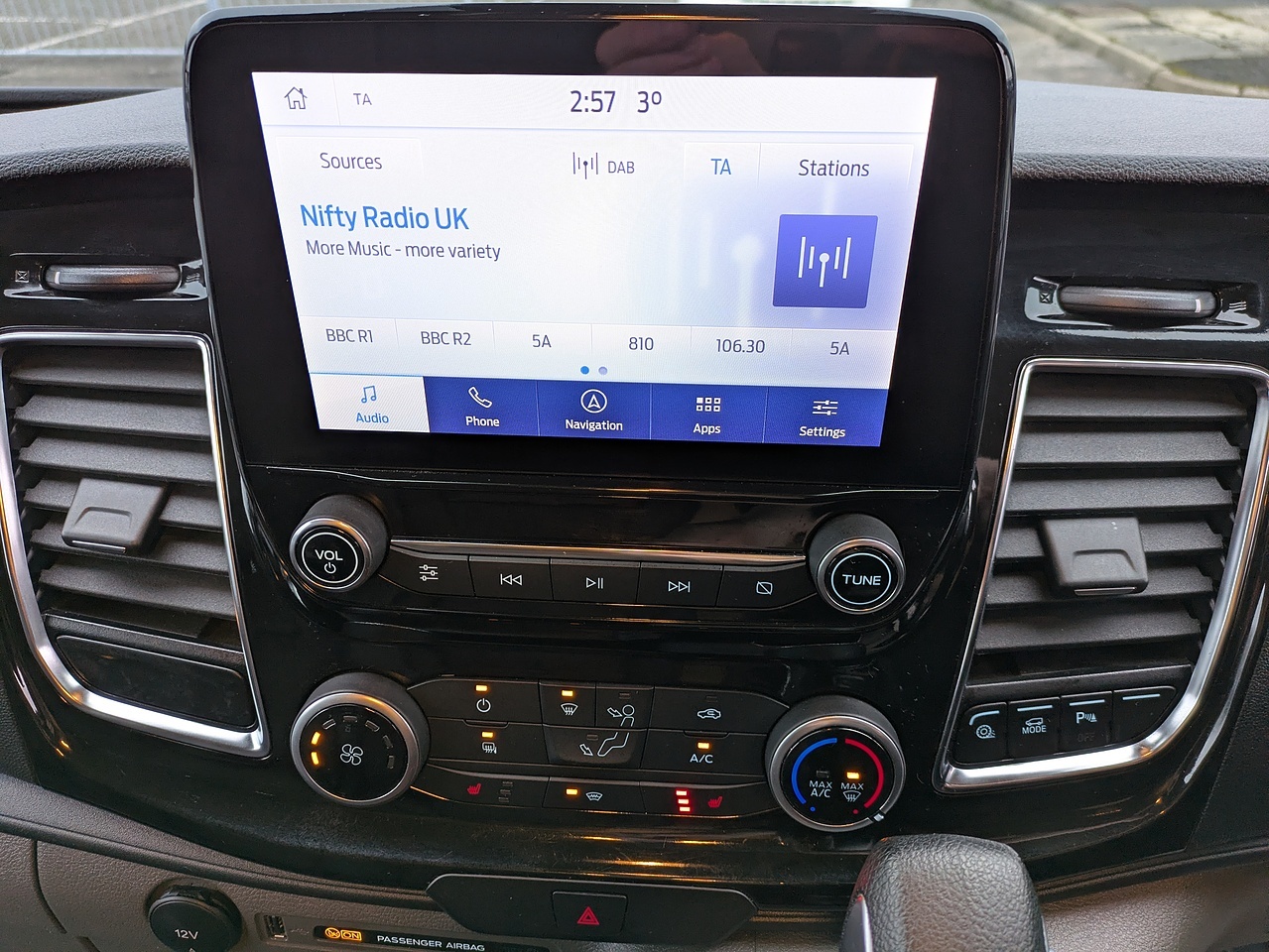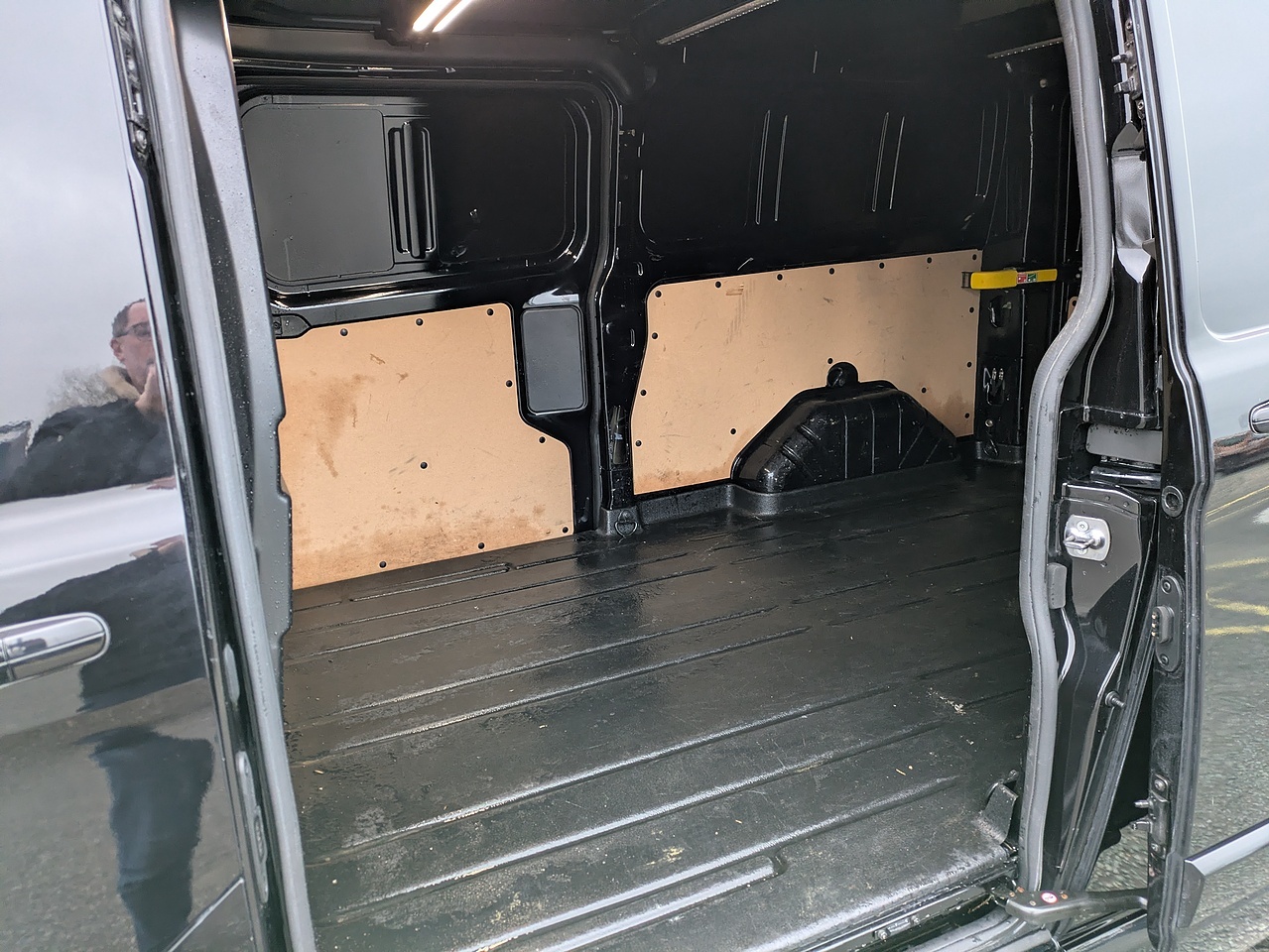 Long wheel-base, 3 seats, Black, 180 Degree Rear Cargo Check Arms, 2 Interior Grab Handles, 2 Key Fobs, 3 Button Key Fob, ABS and ESP Plus, Automatic Headlights - Follow Me Home, Automatic Headlights with Rain Sensing Wipers, Body Colour Rear Bumper, Body Coloured Exterior Mirror Finish, Body Coloured Lift - Decklid Exterior Handles, Body Coloured Plastic Front Bumpers, Bodyside Mouldings - Body Colour, Bottle Holder - Twin 2 litre Bottle Capacity - Facia-Mounted, Bulkhead - Full Steel with Load Through Hatch, Chrome Grille with 3 Bars, Colour Keyed Exterior Pack, Complete Rear Trim Board, Configurable Unlocking - Config 1, Courtesy Lights - Header, Daytime Running Lights Level 2, Digital Rear View Mirror, Door Handles - Body Colour, Door Open Tyre Carrier Drop, Doors - Rear Hinged, Doors Auto Re-Locking, Driver Airbag Restraint, Driver Illuminated Sunvisor, Dual Note Electric Horn, ESC - Electronic Stability Programme, Electric Windshield Defroster, Electrically-Operated Front Windows with One Touch Drivers, Embedded Modem, Emergency Brake Light Flashing, Extra Heavy Duty Alternator, Floorwell Lights, Ford Easy Fuel System, Front Active Seat Belts, Front Fog Lights, Front Fog Lights with Adaptive Cornering, Front Headlamp Leveling, Front Parking Aid, Front Seat Belts with Pre-Tensioners, Front Splash Guard - Mud Flaps, Header Mounted Courtesy Light - 2 Maplights, Header Mounted Package Tray, Headlights - Halogen Projector, Headlights - Quad Beam, High Mounted Stop Lamp, Hill Start Assist, ICE Feature Pack 21, Inclination Anti-Theft Sensor, Interior Trim Accent Pack C, Kerbside Side Load Door, LED Load Compartment Light - Rail, Load Area Protection Kit 2, Manual Air Conditioning, Mechanical Parking Brake, Mini Overhead Console, Moulded Load Floor Liner, Multi Channel Door Entry Remote